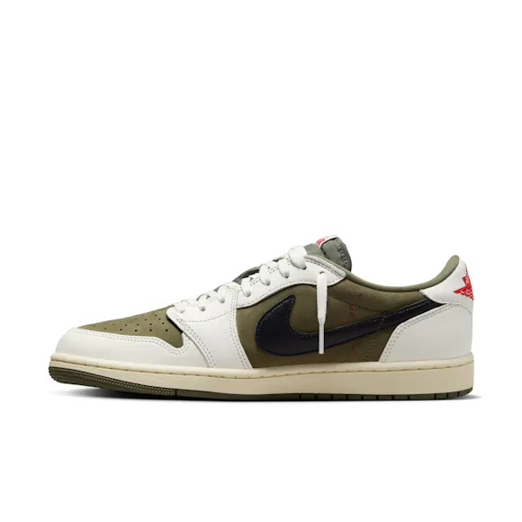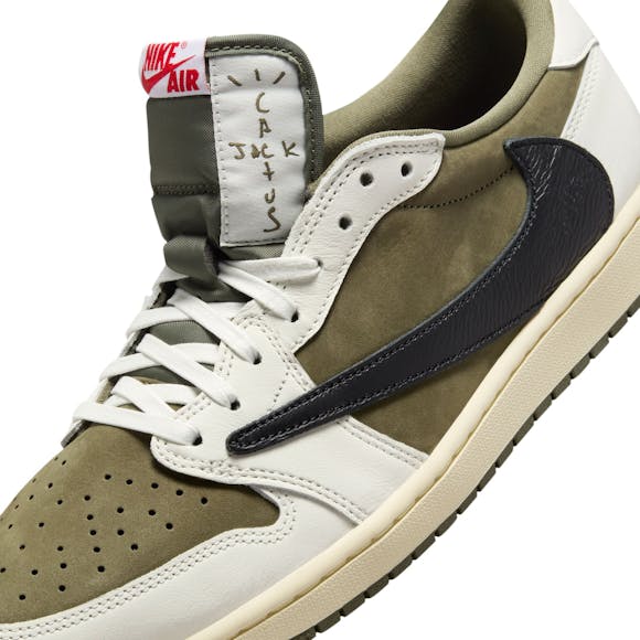 Air Jordan 1 Low OG SPMen's ShoesGo big—Cactus Jack style—with this fresh take on your favorite AJ1s. The staples of style and comfort you know and love are there: Air in the sole keeps your step light and leather uppers remain durable and stylish. But Travis Scott's signature style flips the script, resulting in a shoe that stands out like no other. Dripping in DetailsThe backward Swoosh is a hallmark of La Flame’s animated style and the heels feature two distinct logos—one with the Cactus Jack insignia and the other with Jordan's original Wings.Premium MaterialsA mixture of tumbled and smooth leather come together for a crisp and durable masterpiece.Air-Cushioned StepsNike Air technology provides lightweight cushioning. A solid-rubber outsole offers durability on a variety of surfaces. Style Code: DM7866-200 Color: MEDIUM OLIVE/BLACK-SAIL-MUSLIN