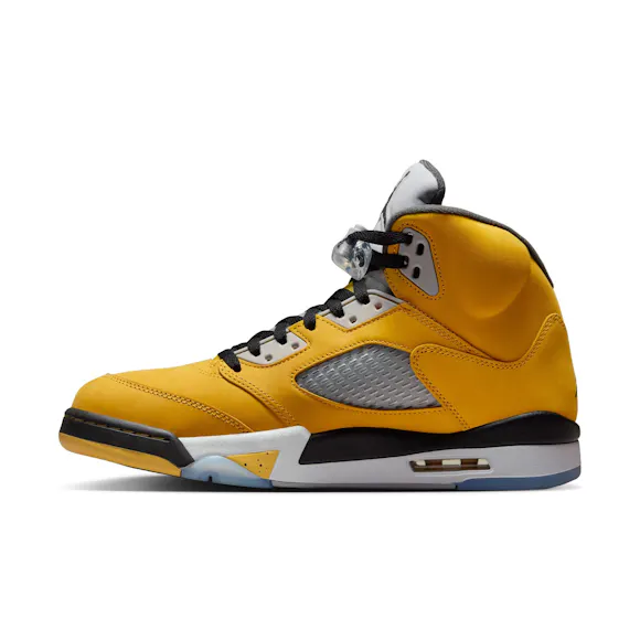 Air Jordan 5 Retro "Varsity Maize and Wolf Grey"Men's ShoesThere's a reason MJ's fifth shoe remains a fan favorite. Its fierce zig-zag midsole, iconic lace locks and mesh-inspired cage make it instantly recognizable, giving you standout style that looks as good on the street as it did on the hardwood. Real and synthetic leather in the upper offers durability and structure.Nike Air unit helps provide lightweight cushioning.Rubber in the outsole helps give you durable traction. More Details Not intended for use as Personal Protective Equipment (PPE)
