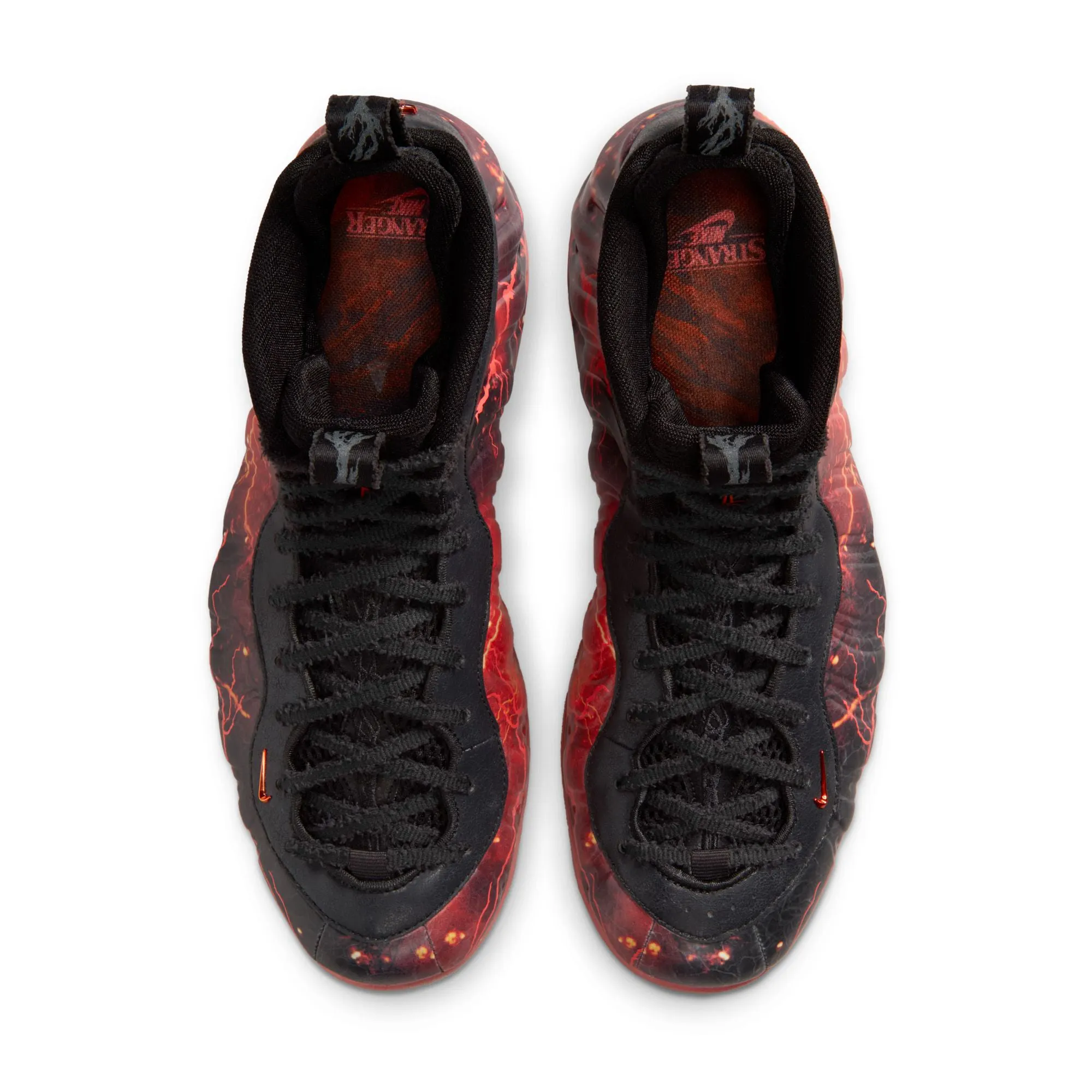 Nike Air Foamposite One x Stranger ThingsMen's ShoesThe hooded cultists chant, "Hail Lord Vecna. Hail Lord Vecna." You are in Vecna's mind lair now. With every step in this special edition Air Foamposite One, you go deeper into the red mist and fog. You can see the vines that connect to his throne. They glow in the dark. You can see the ravages of time in the cracked synthetic leather, the distressed laces. What else will you find? Your worst nightmares and deepest held fears? This shoe contains many details related to the fifth and final season of Stranger Things. We imagine you found the upside down logos. Maybe it isn't about what you have discovered though, but what happens when, after so much searching, Vecna has finally found you. Foamposite upper molds to your foot for a glove-like fit.Heel and full-length Air Zoom cushioning provides bouncy, lightweight comfort.Glow-in-the-dark rubber outsole with herringbone tread adds durable traction. Style Code: IR7336-001 Color: BLACK/BRIGHT CRIMSON-OFF NOIR